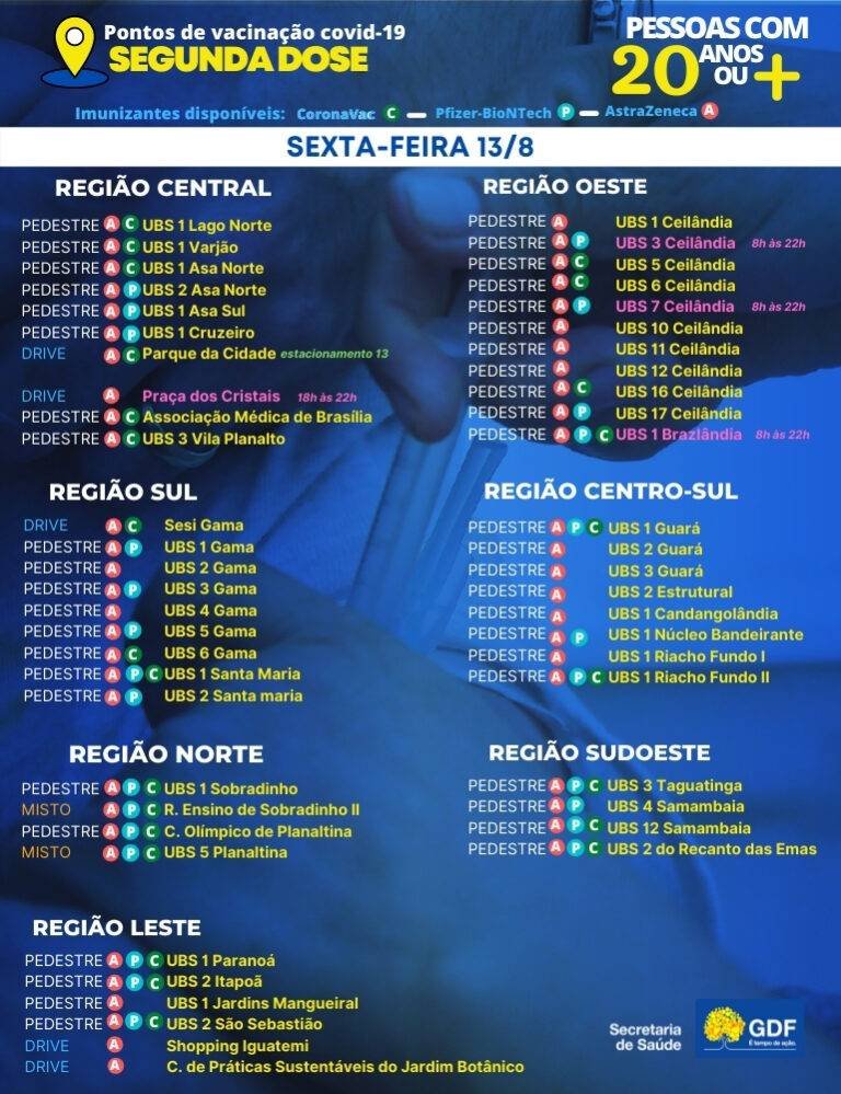 Para receber a segunda dose, a Secretaria de Saúde orienta verificar quais os pontos que oferecem o imunizante recebido na etapa inicial da vacinação. Veja a relação dos locais: