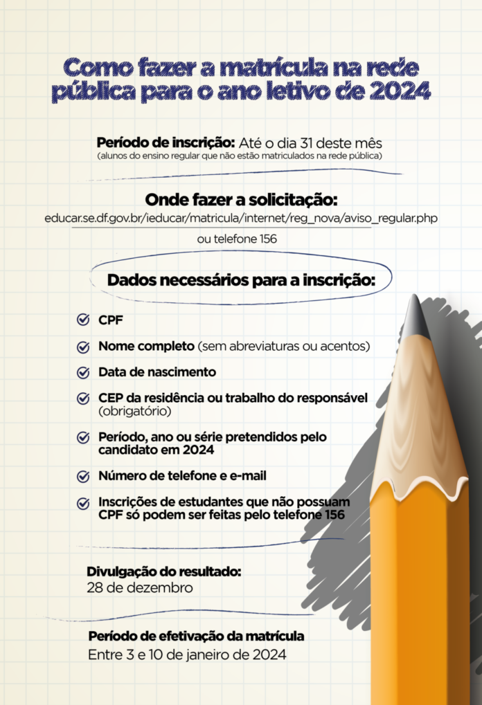 O Governo do Distrito Federal (GDF) espera receber no próximo ano letivo cerca de 30 mil novos alunos na rede pública. As inscrições para o ingresso dos novos estudantes estão abertas e seguem até o dia 31 deste mês, pelo site da Secretaria de Educação (SEE) ou pelo telefone 156.