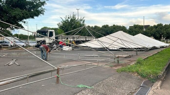 A montagem das novas tendas de acolhimento dos pacientes com dengue teve início neste domingo (31). O caminhão com as primeiras estruturas chegou no Distrito Federal vindo de Tocantins (TO) no começo da tarde. As cidades de Águas Claras, Gama e Guará foram as primeiras a receber os materiais que serão usados para a implantação das unidades de atendimento, com as estruturas sendo descarregadas nos estacionamentos da Unidade Básica de Saúde (UBS) 1 do Areal, UBS 1 do Guará e do Hospital Regional do Gama (HRC).