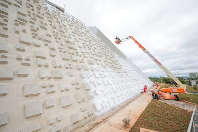As equipes que atuam na reforma do Teatro Nacional Claudio Santoro iniciaram o trabalho de recuperação das fachadas do equipamento público. Há frentes de trabalho nas empenas laterais e na parte que dá acesso ao foyer da Sala Martins Pena. O serviço consiste na limpeza e na pintura do concreto.