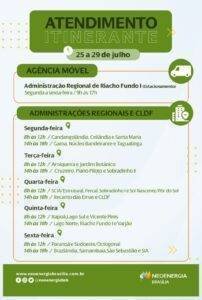 Confira abaixo os locais de atendimento itinerante da Neoenergia Brasília entre os dias 25 a 29 de julho: