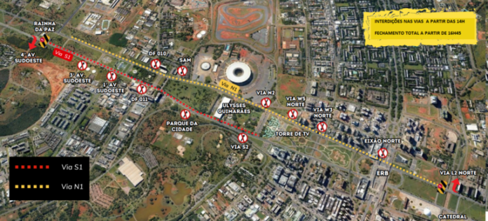 As vias S1 e N1 (da Praça do Buriti até a ligação antes da Catedral Rainha da Paz) ficarão sob a responsabilidade da PMDF, enquanto a via N1 (da Praça do Buriti até a Esplanada dos Ministérios) ficará sob os cuidados do Detran-DF. A via S1, no trecho entre o Buriti e a Catedral Rainha da Paz será fechado totalmente entre as 16h45 e 19h.