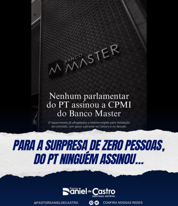 Em mais um posicionamento contundente, o deputado distrital Daniel de Castro elevou o tom e colocou o dedo na ferida ao comentar a ausência total de assinaturas de parlamentares do PT na CPMI do Banco Master.