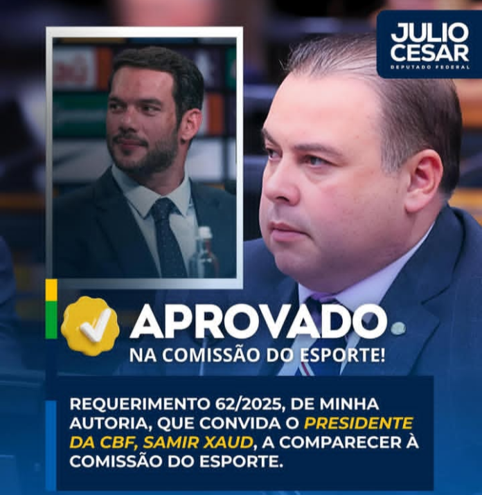 A Comissão do Esporte da Câmara dos Deputados aprovou nesta semana o Requerimento 62/2025, de autoria do deputado federal Júlio Cesar Ribeiro (Republicanos-DF), que solicita a presença do novo presidente da Confederação Brasileira de Futebol (CBF), Samir Xaud, em audiência pública com os parlamentares que integram a comissão.