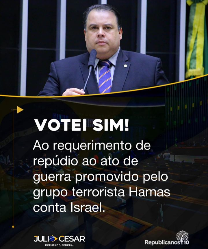 “Consideramos que os bombardeios realizados em Israel são atos de terrorismo e desrespeitam as regras internacionais, devendo ser condenados por todas as nações civilizadas” (Disse Júlio Cesar- Repúblicanos).
