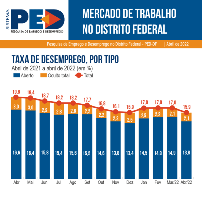 O desemprego segue em queda no Distrito Federal e diminuiu de 19,6% para 15,9%, entre os meses de abril de 2021 e de 2022. É o que aponta a Pesquisa de Emprego e Desemprego do DF (PED-DF), levantamento mensal feito em parceria entre a Companhia de Planejamento do DF (Codeplan) e o Departamento Intersindical de Estatística e Estudos Socioeconômicos (Dieese).