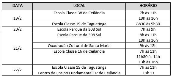Para a próxima semana, estão programadas ações de policiamento e fiscalização de trânsito em todas as regiões administrativas do DF, com foco na segurança dos alunos. Diariamente, serão 38 Pontos de Demonstração próximo a escolas e quatro Operações Escolares. Além de realizar controle de tráfego para dar fluidez ao trânsito, os agentes estarão atentos ao respeito à faixa de pedestres, embarque e desembarque de passageiros, transporte de escolares sem autorização, parada e estacionamento de veículos em local que possa trazer riscos ao tráfego e outras irregularidades que comprometam a segurança dos usuários das vias.