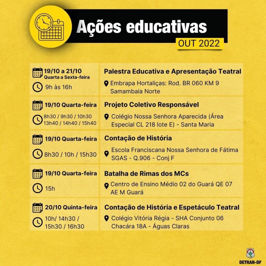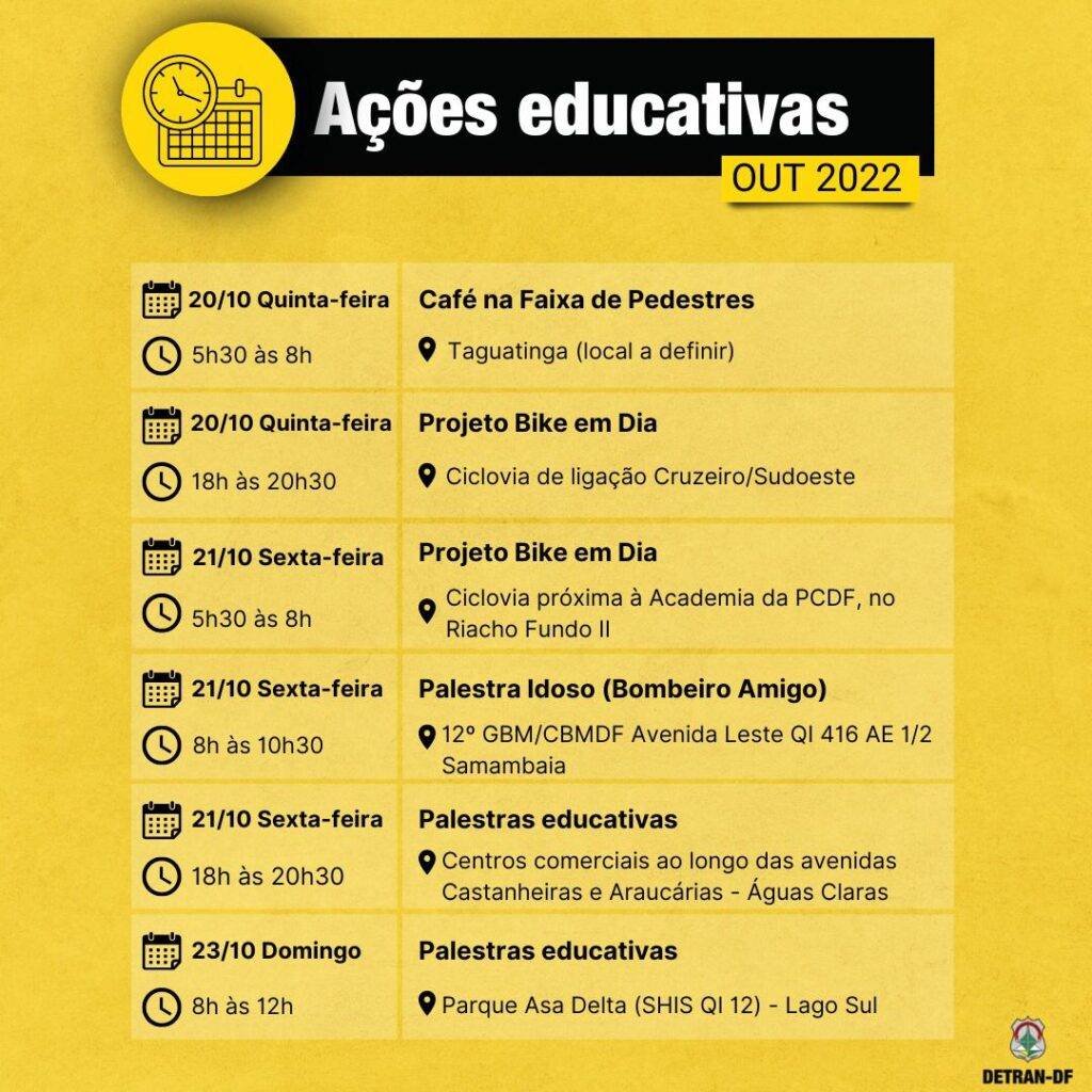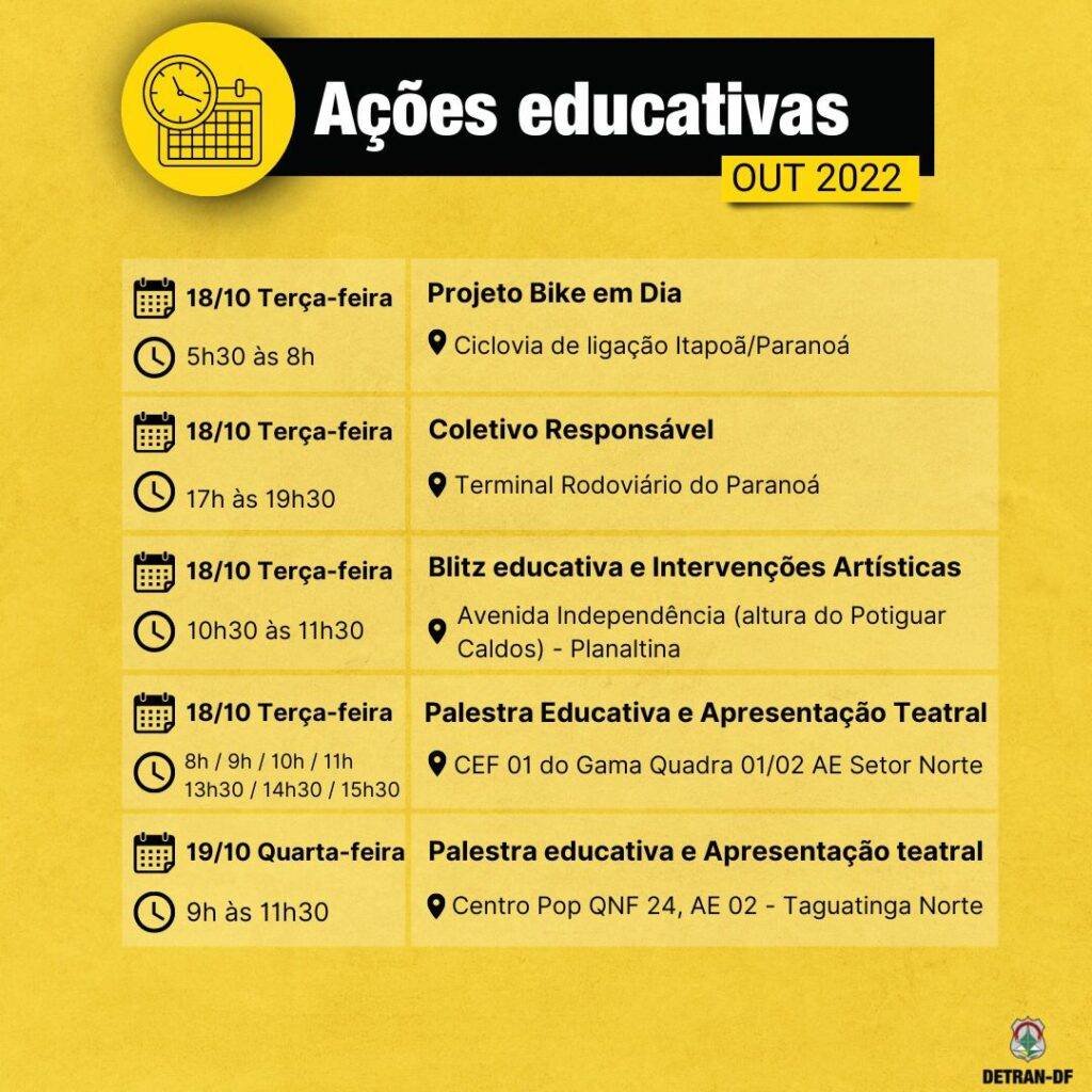De 18 a 23 de outubro, o Departamento de Trânsito do Distrito Federal (Detran-DF) promoverá ações educativas nas regiões de Águas Claras, Asa Sul, Cruzeiro, Gama, Guará, Itapuã, Lago Sul, Paranoá, Planaltina, Riacho Fundo 2, Samambaia, Santa Maria e Taguatinga.