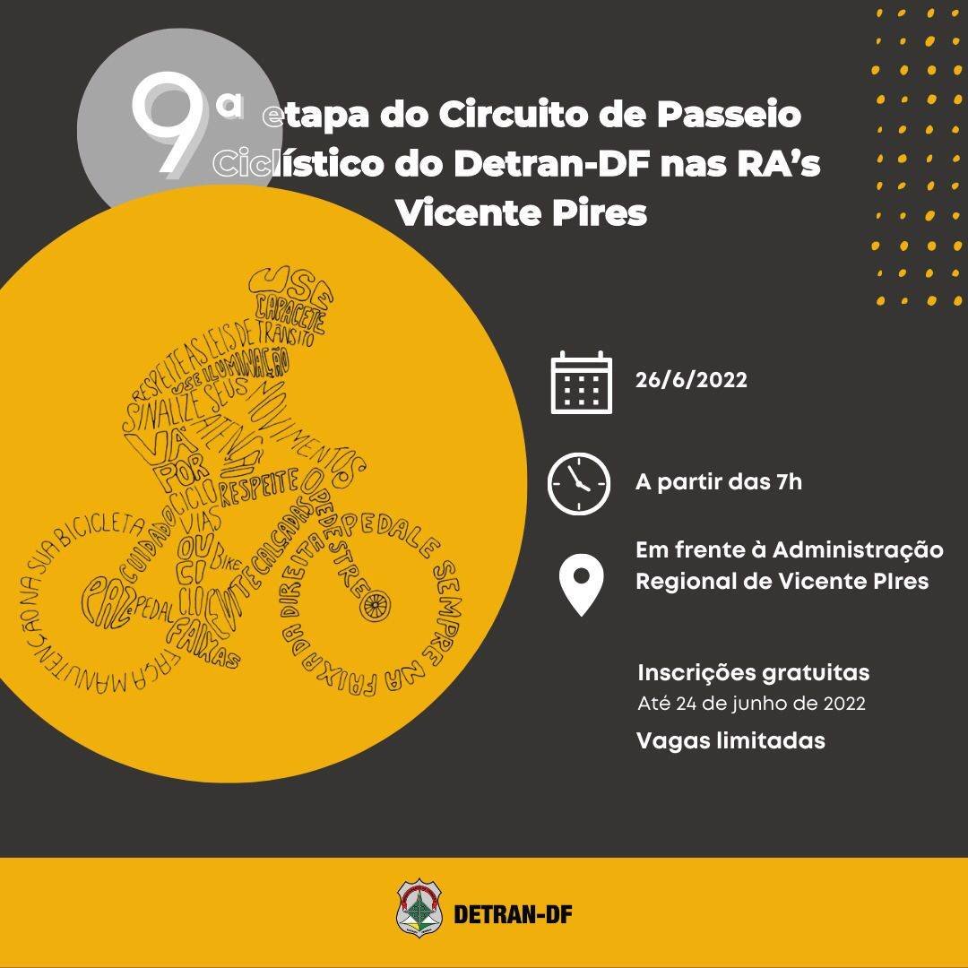 No dia 26 de junho (domingo), o Departamento de Trânsito do Distrito Federal realizará, com o apoio da Administração Regional de Vicente Pires, a 9ª etapa do Circuito de Passeio Ciclístico do Detran-DF na RA’s. A concentração está marcada para acontecer a partir das 7h, em frente a Administração da cidade. A saída está prevista para às 9h.