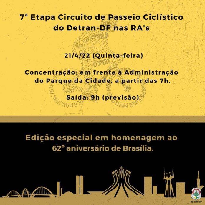 Na quinta-feira (21/4), feriado do Dia de Tiradentes, o Departamento de Trânsito do Distrito Federal realizará, com o apoio da Administração do Parque da Cidade, a 7ª Etapa do Circuito de Passeio Ciclístico do Detran-DF na RA’s, em comemoração ao 62º aniversário de Brasília.