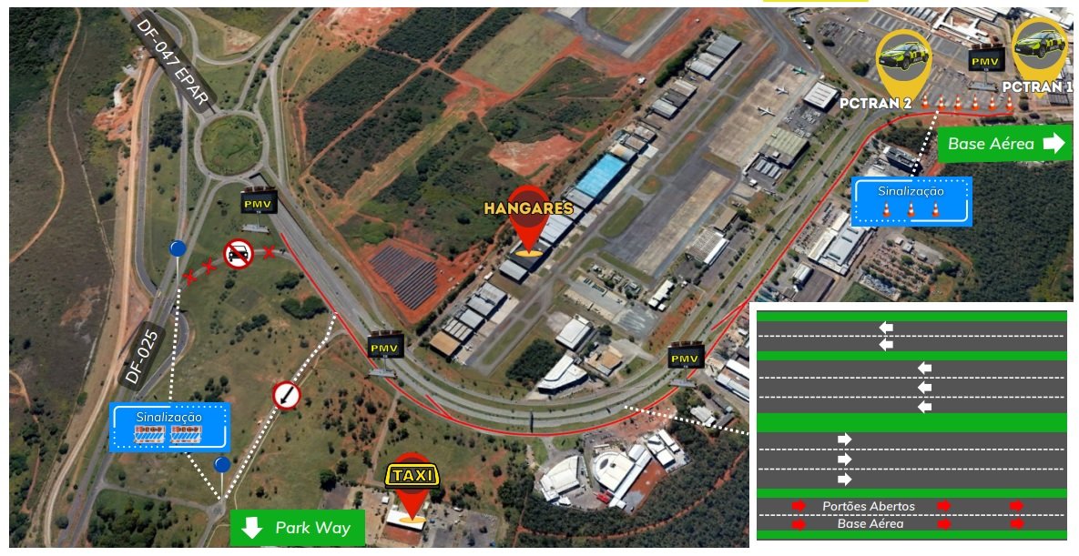 No Aeroporto Internacional de Brasília, acontecerá o evento Portões Abertos 2023 da Base Aérea de Brasília. Para garantir a segurança dos participantes, o Detran-DF fará o fechamento da rotatória do Park Way (Quadra 14, Conjunto 1) sentido marginal da DF-047 (EPAR). Também será fechada a alça de ligação da DF-025 para a marginal da DF-047 e será implantada uma faixa reversa de emergência para ambulâncias, viaturas e táxis na via de acesso à Base Aérea. Além de colocar redutores de velocidade, o Detran vai utilizar painéis móveis para orientar o fluxo de veículos nas imediações do aeroporto. A previsão é que o evento ocorra durante todo o dia, com dispersão prevista para as 16h, quando os agentes farão controle manual do tráfego, dando preferência aos veículos que estiverem saindo da Base Aérea.
