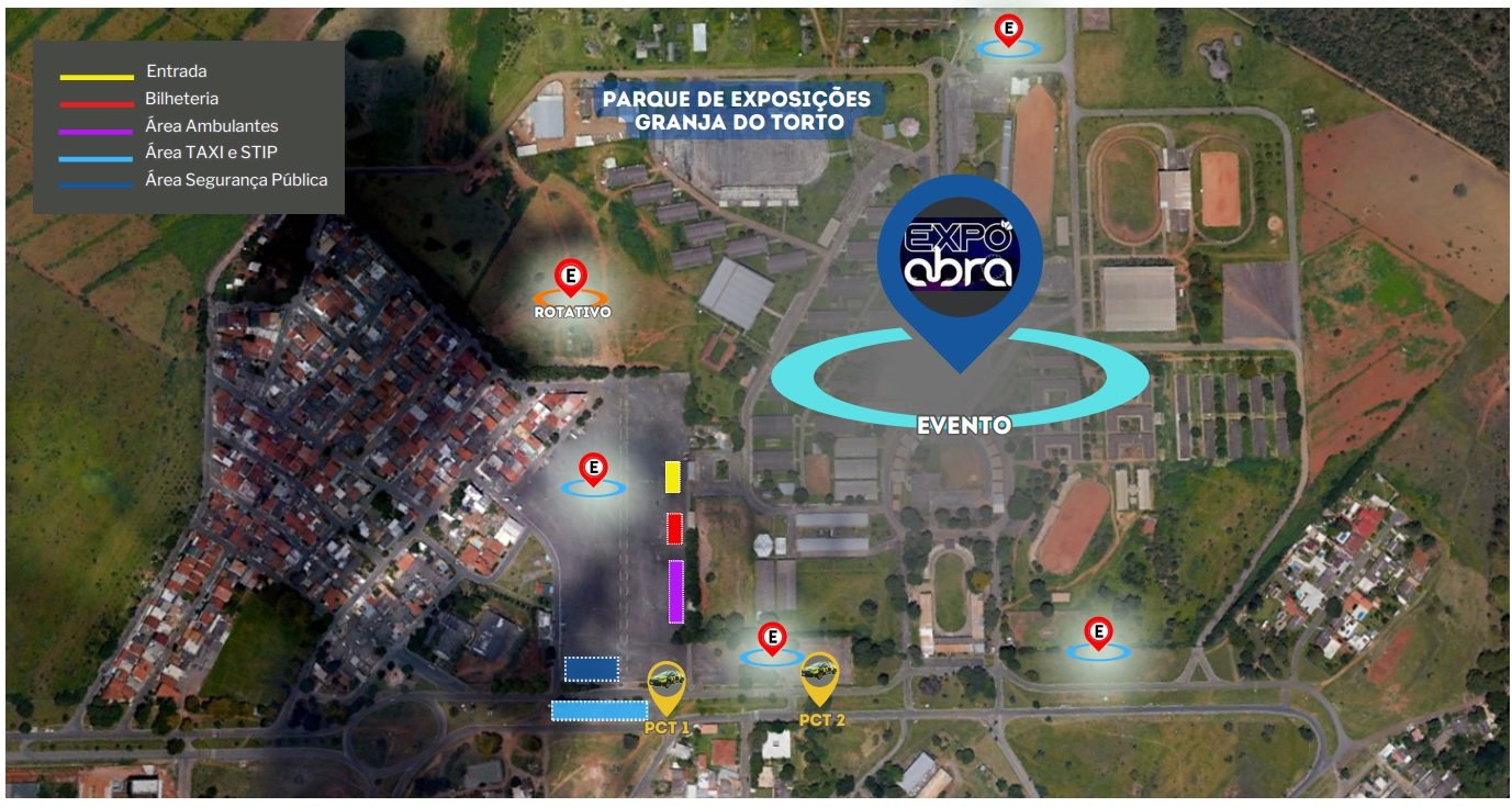 No Parque de Exposição Agropecuária Granja do Torto, terá a 31ª ExpoAbra 2023. Em razão do evento, que conta com estimativa de público de 10 mil pessoas, os agentes de trânsito do Detran-DF farão controle de tráfego e auxiliarão os pedestres em suas travessias. Para isso, será realizada a sinalização do entorno do parque, implantando travessias de pedestre e destinando área específica para os veículos da Segurança Pública e para estacionamento, embarque e desembarque de táxis e veículos do Serviço de Transporte Individual Privado de Passageiros por Aplicativos (Stip). A ExpoAbra começa no domingo (3) e vai até o dia 17 de setembro. Em dias de shows, de 6 a 9 e de 14 a 16 de setembro, serão montados dois Pontos de Controle de Trânsito (PCTran), das 18h30 até as 3h da madrugada. Nos dias sem shows, de 10 a 13 e 17 de setembro, os agentes atuarão com patrulhamento, das 16h às 22h.