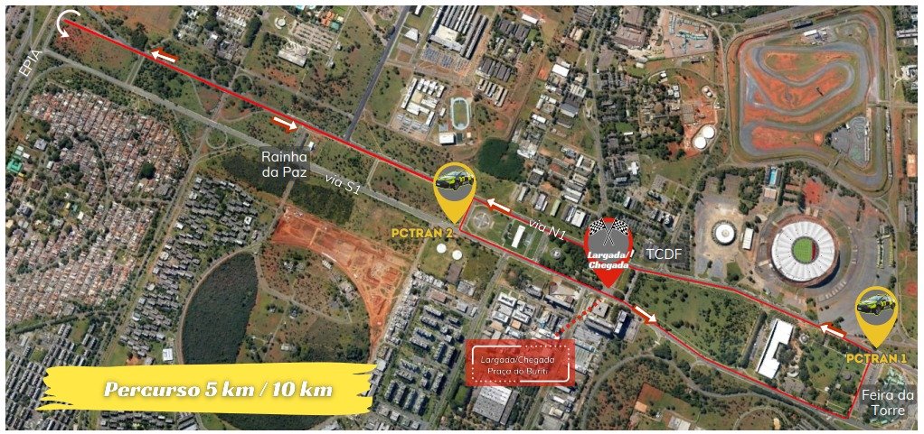 No Eixo Monumental, ocorrerá Nutrição Brasil Run, com largada prevista para as 7h. Por isso, a partir das 6h30, três faixas próximas ao canteiro central da via N1 – entre a Epia e o espaço Funarte, e da S1 – da Praça do Cruzeiro até o espaço Funarte, estarão fechadas para veículos. Este espaço será destinado aos atletas que farão os percursos de 5km e de 10km. As vias de ligação S1/N1, durante todo o trajeto, também estarão fechados. Apenas o acesso à catedral Rainha da Paz, pela via S1, permanecerá aberto durante a corrida.