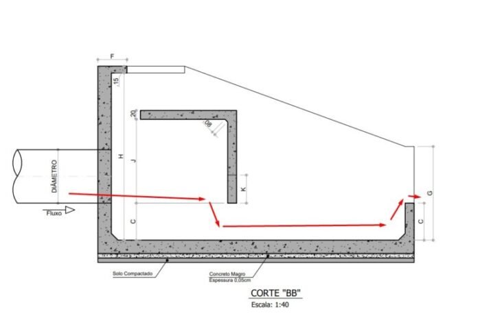 A estrutura do dissipador é simples, mas bastante eficiente. Visto de lado, ele é como um reservatório retangular com a parede de entrada mais alta do que a parede de saída. Um pequeno muro em forma de L é construído no interior do depósito. O obstáculo diminui a energia da água, caso ela venha com uma velocidade mais elevada.