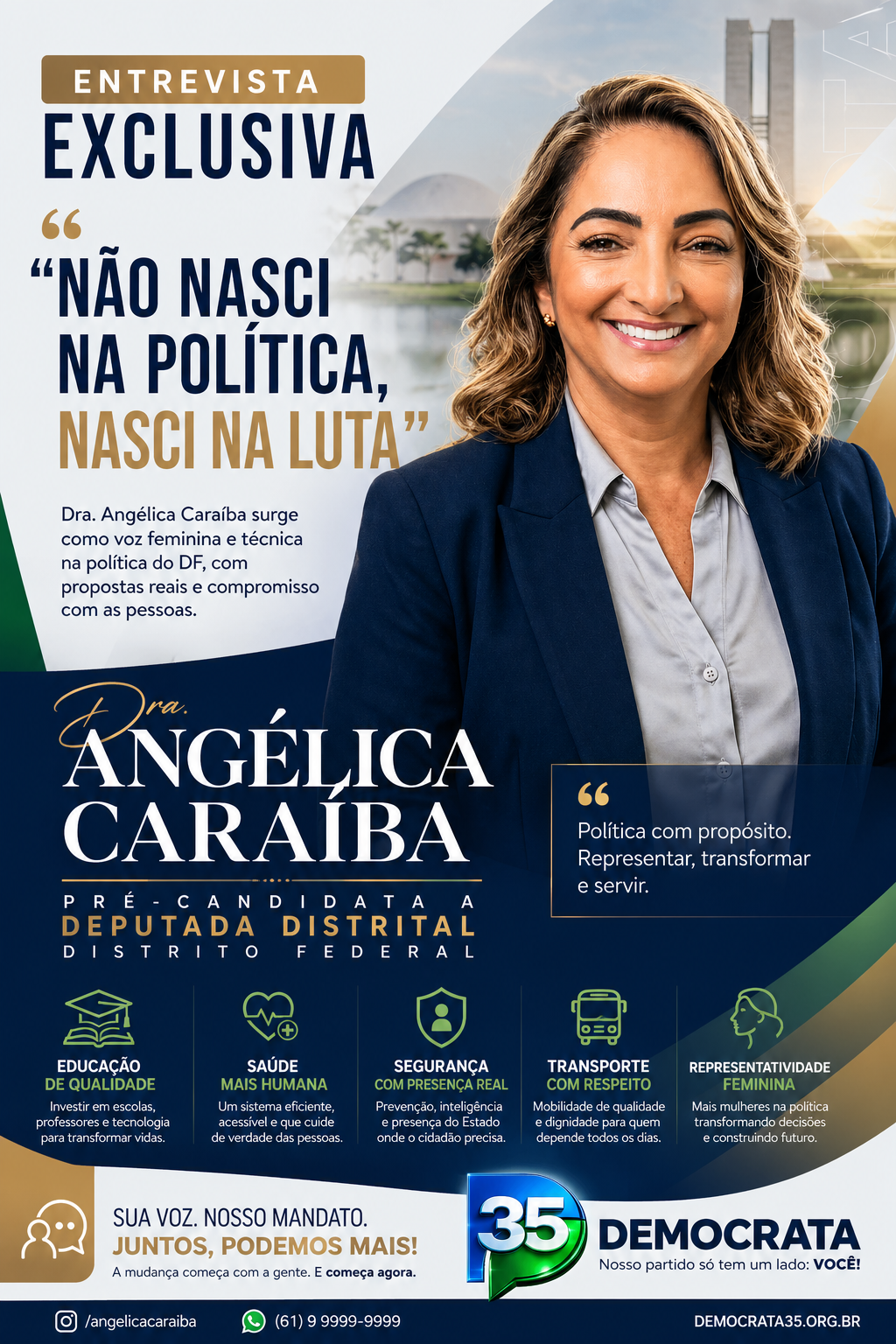 Com um discurso que equilibra emoção e responsabilidade institucional, Angélica defende uma atuação legislativa focada em educação de qualidade, fortalecimento das políticas públicas e ampliação da participação popular nas decisões do Distrito Federal.