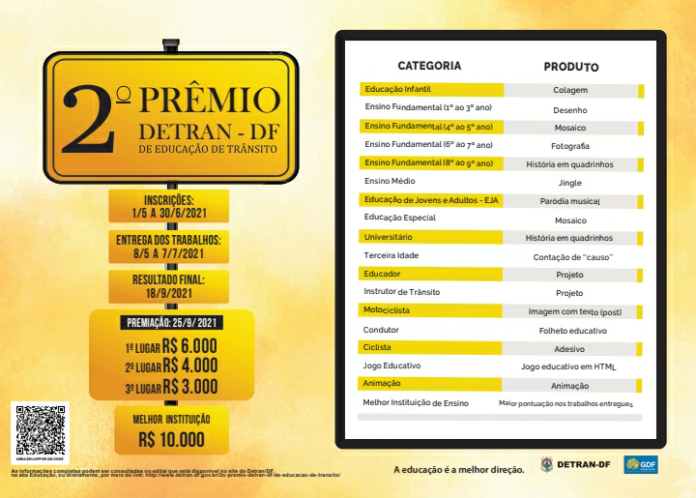 Para conferir os temas e as regras para cada categoria, basta acessar o edital do concurso disponível no link: http://www.detran.df.gov.br/2o-premio-detran-df-de-educacao-de-transito/