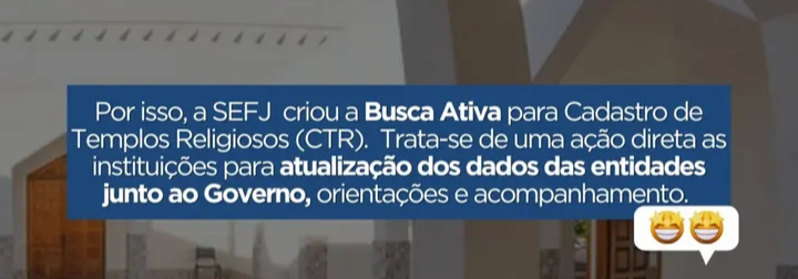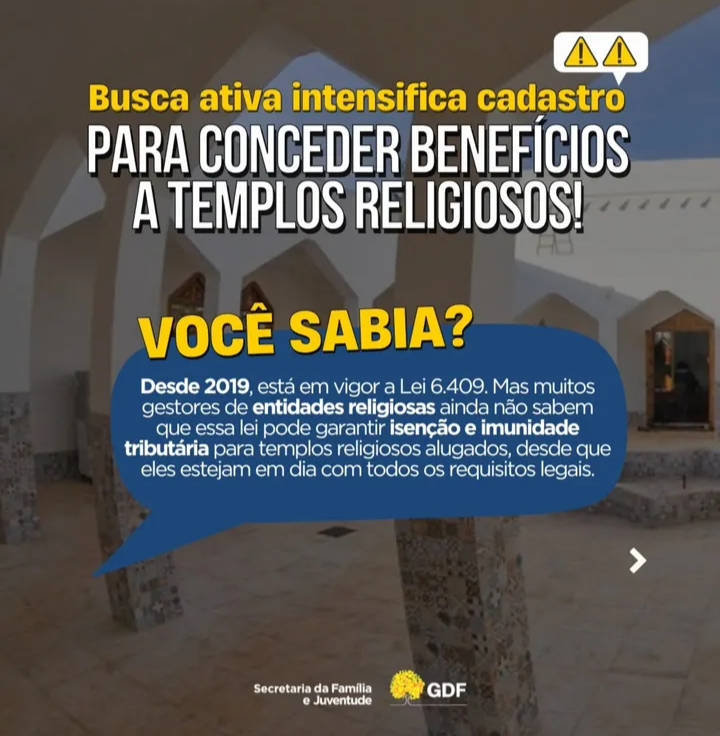 Paralelamente, a Secretaria da Família e Juventude (SEFJ), sob comando de Delmasso, intensifica a Busca Ativa para o Cadastro de Templos Religiosos (CTR). A iniciativa tem como objetivo informar líderes religiosos sobre a Lei nº 6.409, em vigor desde 2019, que garante isenção e imunidade tributária a templos alugados que estejam em conformidade com todos os requisitos legais.