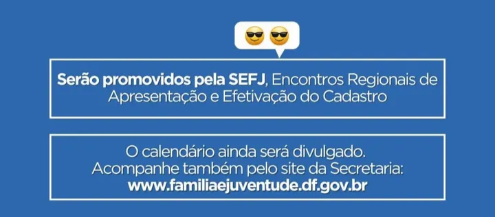 A SEFJ promoverá encontros regionais para apresentação e efetivação do cadastro, orientando e atualizando os dados das instituições junto ao Governo. O calendário oficial será divulgado em breve e poderá ser acompanhado no site www.familiaejuventude.df.gov.br.