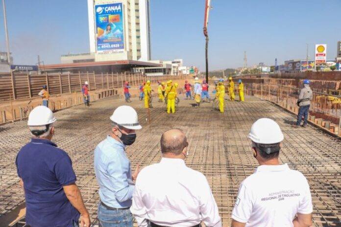 Considerada uma das maiores obras viárias em andamento no país, o Túnel de Taguatinga chega a uma importante etapa de execução: a concretagem da laje. A fase consiste em preencher o teto do túnel com brita, areia, cimento e outros materiais em um metro de espessura. O serviço teve início no passado sábado (28) e, nesta terça (31), foi acompanhado de perto pelo governador Ibaneis Rocha e secretários de governo. Atualmente, a obra do túnel está 45% executada.
