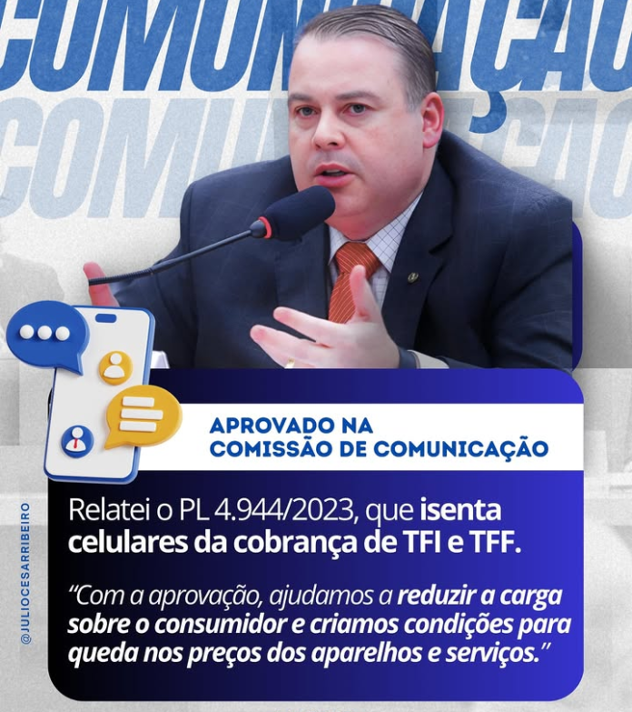 Foi aprovado na Comissão de Comunicação da Câmara dos Deputados o Projeto de Lei 4.944/2023, de relatoria do deputado federal Júlio Cesar Ribeiro (Republicanos-DF). A proposta tem como objetivo isentar os telefones celulares da cobrança das taxas de Fiscalização de Instalação (TFI) e de Funcionamento (TFF), atualmente arrecadadas pelo Fistel (Fundo de Fiscalização das Telecomunicações).