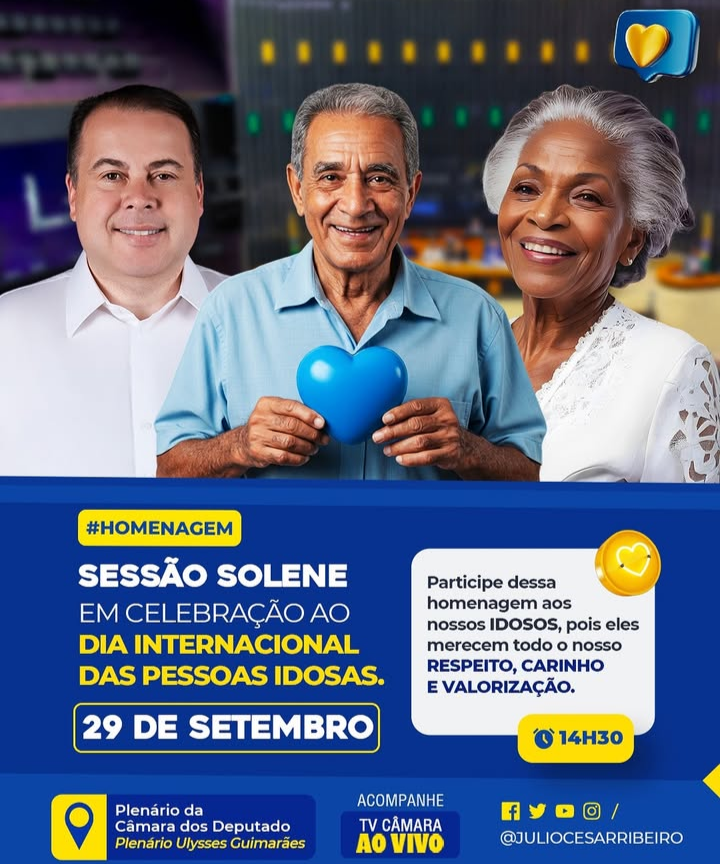 No próximo dia 29 de setembro, o Plenário Ulysses Guimarães sediará uma sessão solene em celebração ao Dia Internacional das Pessoas Idosas. A iniciativa, apoiada por Júlio César Ribeiro, busca reconhecer o papel fundamental dessa população na construção do país. O evento ressalta a importância do respeito, carinho e valorização aos idosos, reforçando a necessidade de políticas públicas que assegurem qualidade de vida e dignidade na terceira idade.