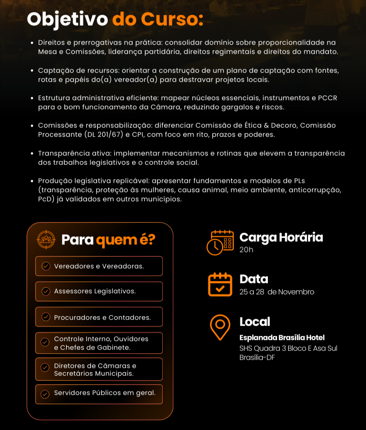 O evento oferece capacitação integral em áreas essenciais para mandatos e gestão política, incluindo: