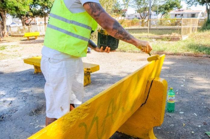 Roçagem, capina, poda de árvore, pintura e limpeza estão entre os serviços realizados no local, que conta com duas quadras, equipamento para atividade física e bancos.