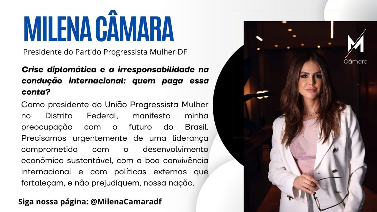 Como presidente do Progressista Mulher no Distrito Federal, manifesto minha preocupação com o futuro do Brasil. Precisamos urgentemente de uma liderança comprometida com o desenvolvimento econômico sustentável, com a boa convivência internacional e com políticas externas que fortaleçam, e não prejudiquem, nossa nação.