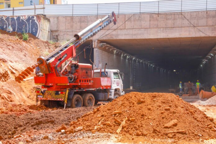 Os mais distraídos talvez nem percebam, mas, ao entrar no Túnel de Taguatinga pela Avenida Elmo Serejo, os motoristas vão passar bem pertinho do metrô. A galeria por onde transita o coletivo fica escondida por um grande aterro. Para proteger a estrutura do subterrâneo, um grande muro de contenção começou a ser construído no emboque do complexo viário.