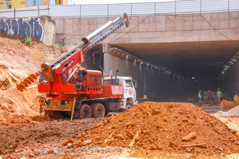 Os furos que vão receber as estacas já começaram a ser feitos, assim como as armações que dão reforço aos pilares. A produção é executada no próprio canteiro de obras do Túnel de Taguatinga – as estruturas são feitas com vergalhões de ferro de 1 polegada. Além de proteger as paredes do metrô, o muro de contenção evitará o deslizamento de qualquer material proveniente do aterro.