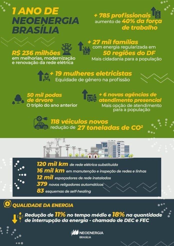 Brasília, 31 de março de 2022 – Com o compromisso assumido com a população de investir em infraestrutura do setor elétrico e assegurar a qualidade dos serviços aos mais de 3,3 milhões de pessoas em todo o Distrito Federal, a Neoenergia Brasília encerra, neste mês de março, o seu primeiro ano de operação na capital federal com números importantes. A distribuidora investiu R$ 236 milhões em melhorias, modernização e renovação de rede elétrica. Um valor, aproximadamente, quatro vezes maior que o de 2020 e superior à soma dos últimos três anos de investimento da companhia.