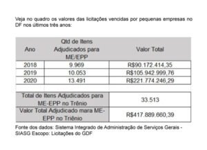 O crescimento da participação do setor nas compras do GDF vem aumentando nos últimos anos. Em 2018, as pequenas empresas venceram concorrências que somaram R$ 90 milhões. Já, em 2020, o valor passou para R$ 221 milhões