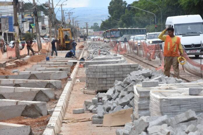Mesmo com as chuvas, 20% da reforma já está executada; a colocação de meio-fio atingiu 9,43% e a pavimentação também já começou.