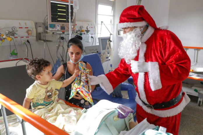 A magia do Natal encantou pacientes internados na emergência pediátrica do Hospital Regional de Planaltina e que aguardavam atendimento no final da tarde desta quarta-feira (21). Papai Noel distribuiu brinquedos e abraços, mudando a rotina habitual de um hospital. A surpresa foi embalada com músicas natalinas tocadas pelo violinista Hudson Mendes, fonoaudiólogo do HRPL.