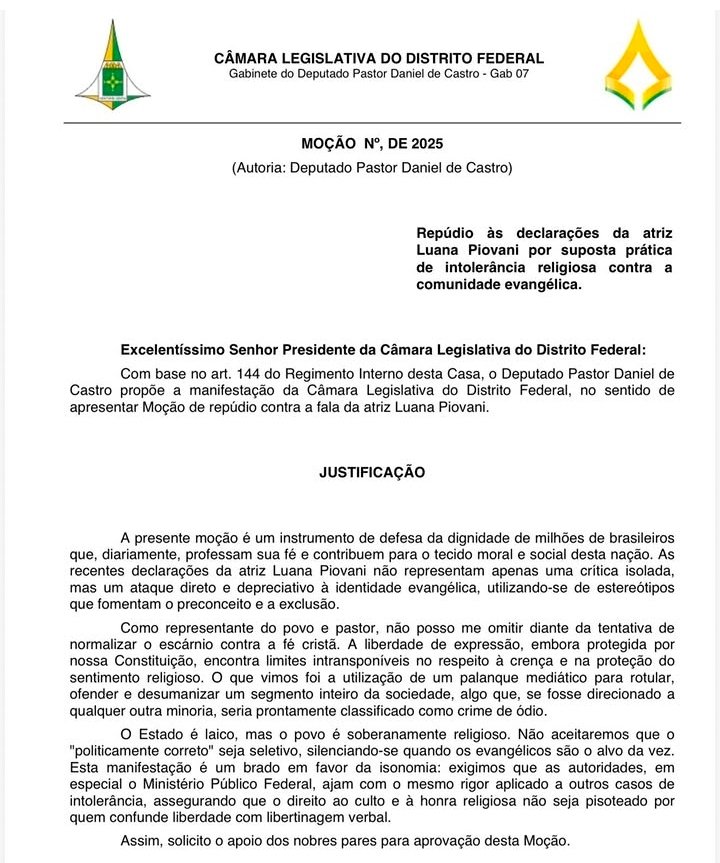 O deputado distrital Pastor Daniel de Castro apresentou na Câmara Legislativa do Distrito Federal (CLDF) uma moção de repúdio contra declarações atribuídas à atriz Luana Piovani, que, segundo o parlamentar, configurariam intolerância religiosa contra a comunidade evangélica.