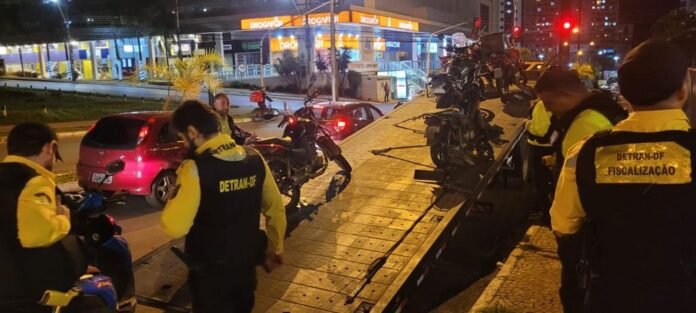 A fiscalização do Detran flagrou 15 motos com escapamentos em desacordo com o estabelecido pelo Código de Trânsito Brasileiro – CTB. Foram abordados condutores de cerca de 220 motocicletas, cinco condutores inabilitados, seis com a CNH vencida, além disso, foram identificadas outras 26 infrações de trânsito e 20 motos foram removidas ao depósito do Detran-DF por estarem com equipamentos de segurança defeituosos ou sem documentação obrigatória.