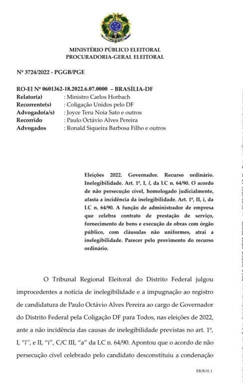 O parecer da PGE é assinado pelo procurador geral eleitoral Paulo Gustavo Gonet Branco e se manifesta favoravelmente a recurso apresentado ao TSE pela Coligação Unidos pelo DF, que pede o indeferimento do registro de candidatura.