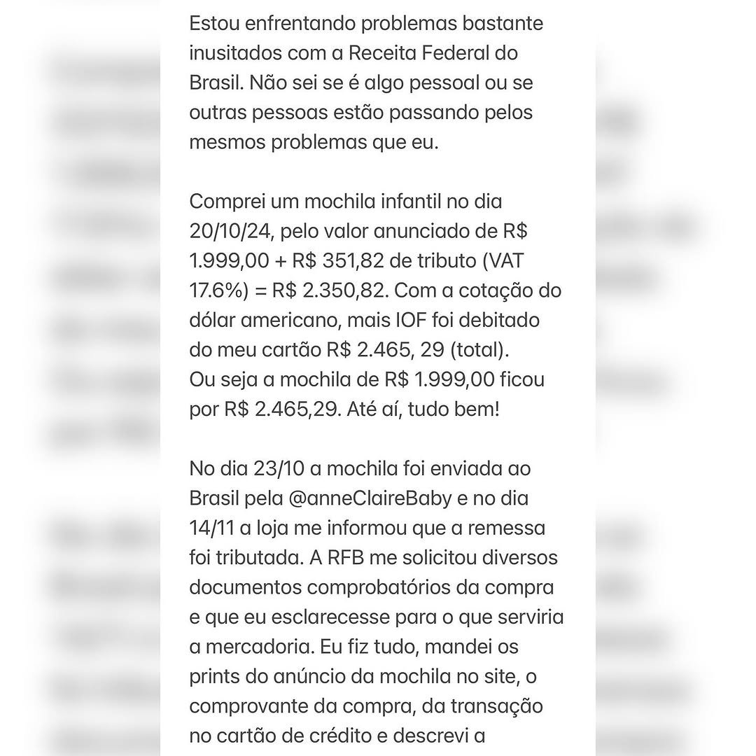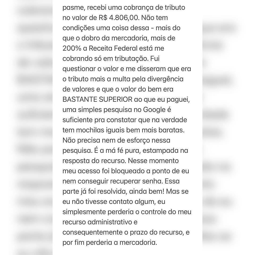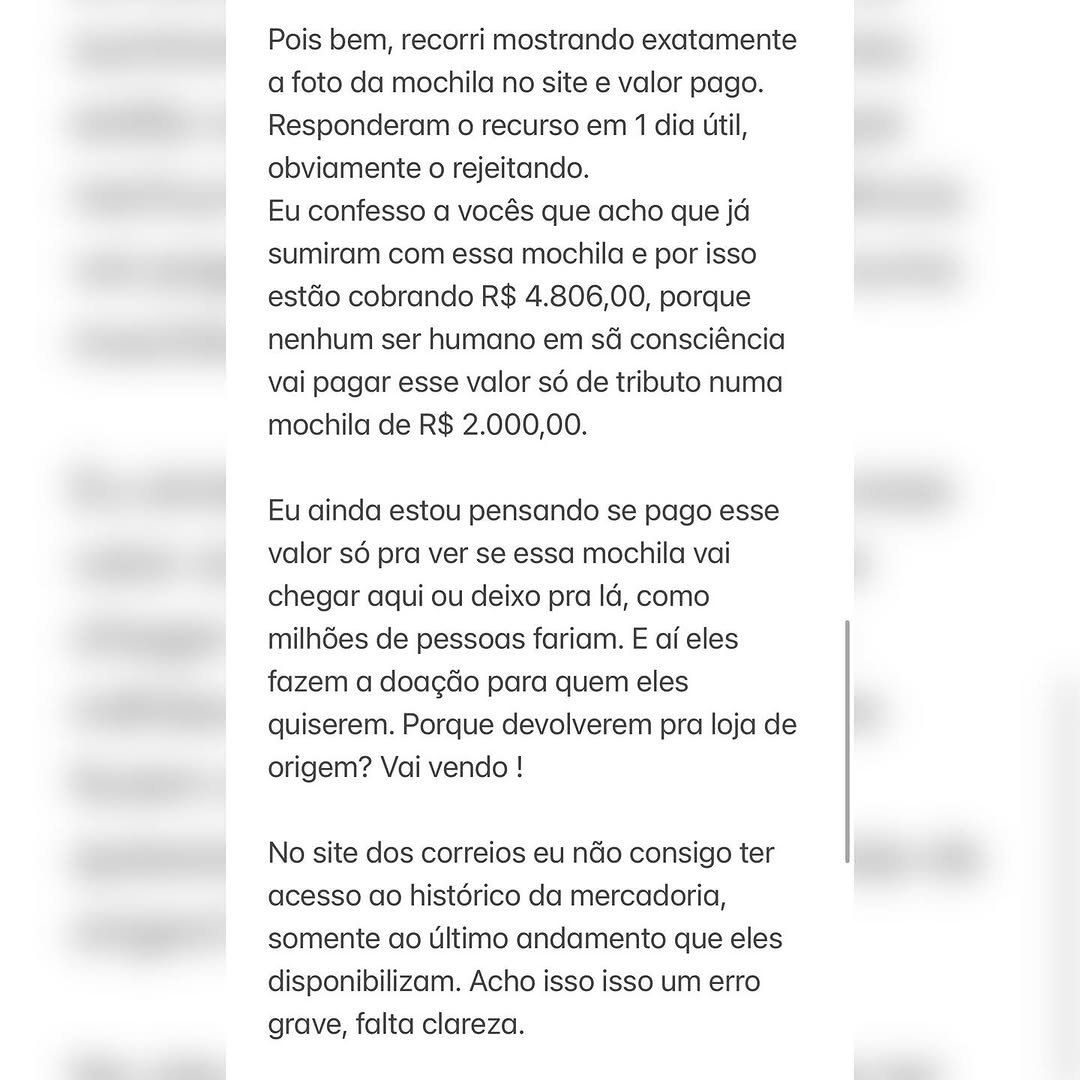 Esse episódio coloca em questão a liberdade do consumidor brasileiro de escolher onde comprar e o que comprar. O sistema fiscal parece tratar o consumidor como suspeito em cada transação, e não há clareza sobre os critérios utilizados para aplicar tais taxas. Esse caso, se não for algo pessoal, revela um problema estrutural sério. Quando uma mochila infantil chega a custar R$ 4.806,00, incluindo impostos e multas, é evidente que há algo muito errado com o sistema.