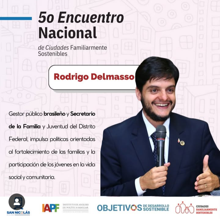 O gestor público brasileiro Rodrigo Delmasso, atual secretário da Família e Juventude do Distrito Federal, marcará presença no 5º Encontro Nacional de Cidades Familiarmente Sustentáveis, que ocorrerá nos dias 23 e 24 de outubro na cidade de San Nicolás de los Garza, Novo León, México.
