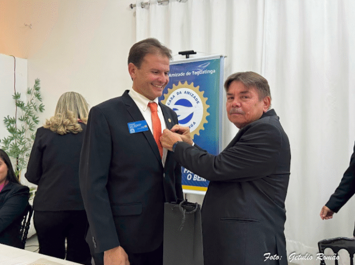 Em seguida, foi a vez do Rotary Club de Taguatinga dar posse ao seu novo presidente. Carlos Alberto Lima Soares transmitiu oficialmente o cargo a Gustavo Serra dos Santos, que emocionou a todos com um discurso sensível e carregado de gratidão. Em lágrimas e com a voz embargada, Gustavo reafirmou seu compromisso com os ideais do Rotary e com a continuidade dos relevantes projetos da instituição.