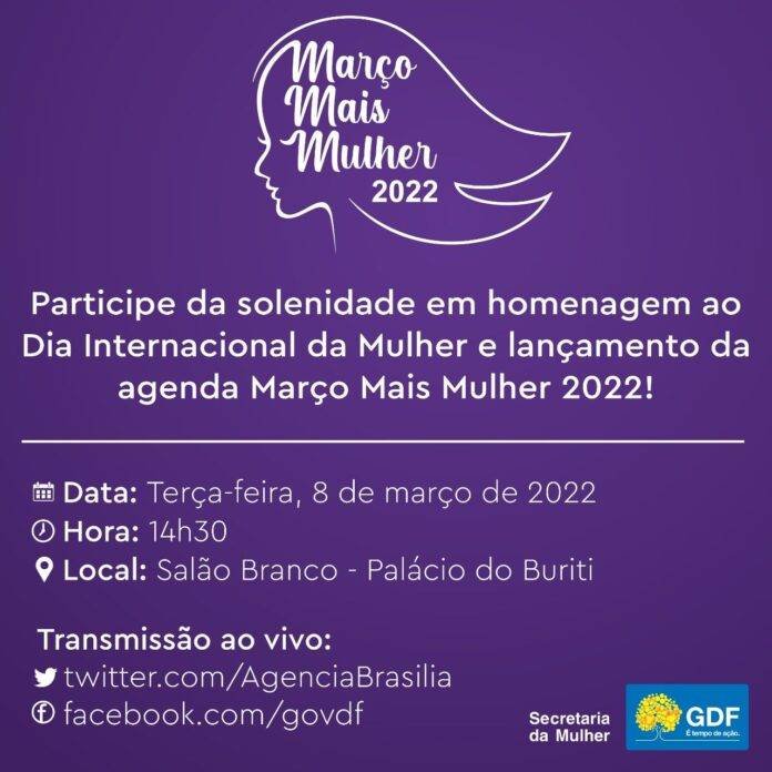 Para celebrar o 8 de março, Dia Internacional da Mulher, a Secretaria da Mulher (SMDF) organizou o “Março Mais Mulher – 2022” e lança, pelo quaro ano consecutivo, uma agenda integrada com as demais secretarias e órgãos do Governo do Distrito Federal (GDF).
