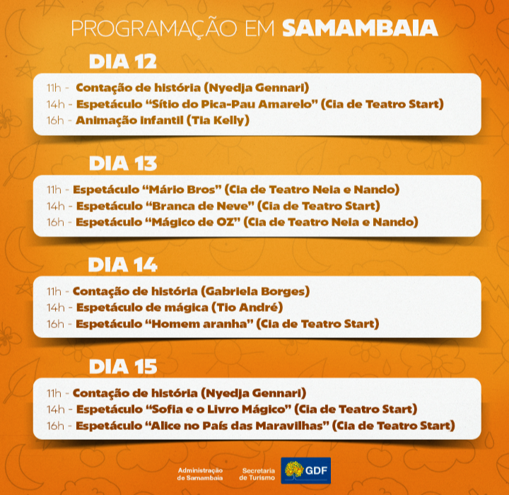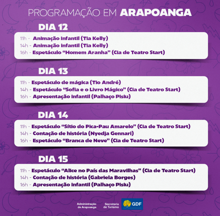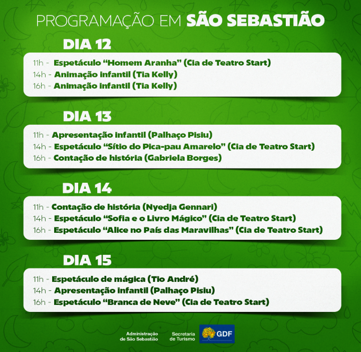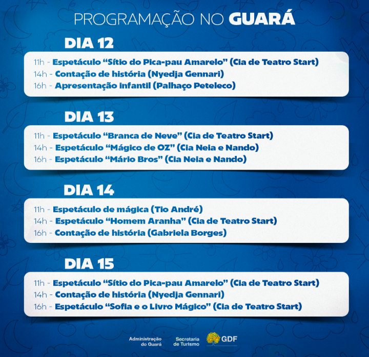 O evento gratuito acontecerá nessas quatro regiões administrativas dos dias 12 a 15 de outubro, das 14h às 17h, nas localidades definidas pelas administrações. Crianças de todas as idades são bem-vindas para aproveitar as mais variadas atrações com apresentações de palhaços, animação, contação de histórias, espetáculo de mágica e apresentações da Cia Teatro Start.