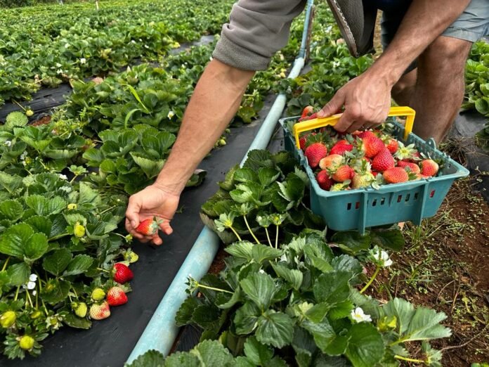 Na propriedade são produzidos mais de 40 tipos de alimentos. Para os morangos, ele destina uma área de 0,25 hectare, que comporta 12 mil pés do fruto. Por dia, durante a safra, Manoel chega a colher entre 100 a 120 caixas de morangos com a ajuda de três funcionários, todos com carteira assinada. “A colheita começa em junho e vai até o início de outubro, mas no ano passado consegui colher até janeiro com o plantio coberto”, disse Manoel.