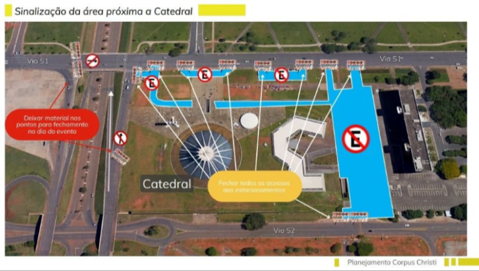 Por volta das 18h30, após a missa, em razão da procissão, a Polícia Militar do Distrito Federal (PMDF) realizará o fechamento da via S1, na altura da Catedral, e da via N1, em dois locais: em frente ao Bloco R e nas proximidades do quartel do Corpo de Bombeiros Militar (CBMDF).