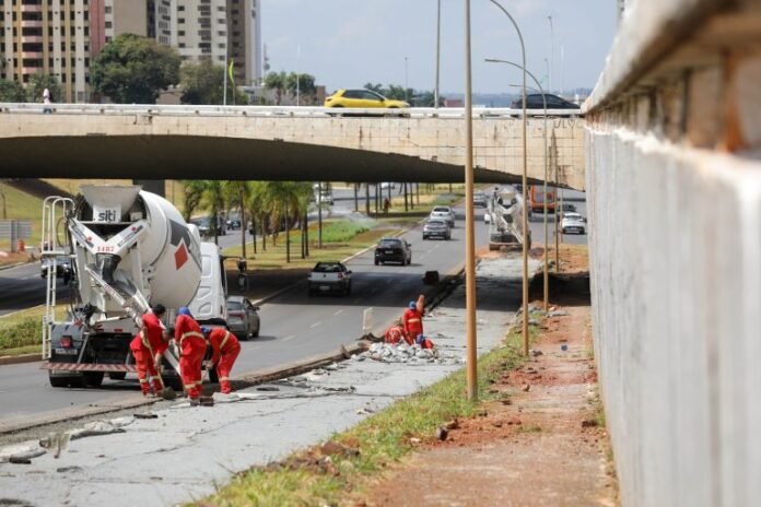 O serviço é feito na 502 Sul, próximo ao viaduto do Eixo Monumental. Cerca de 11 km de corredor em pavimento rígido já foram entregues na avenida.