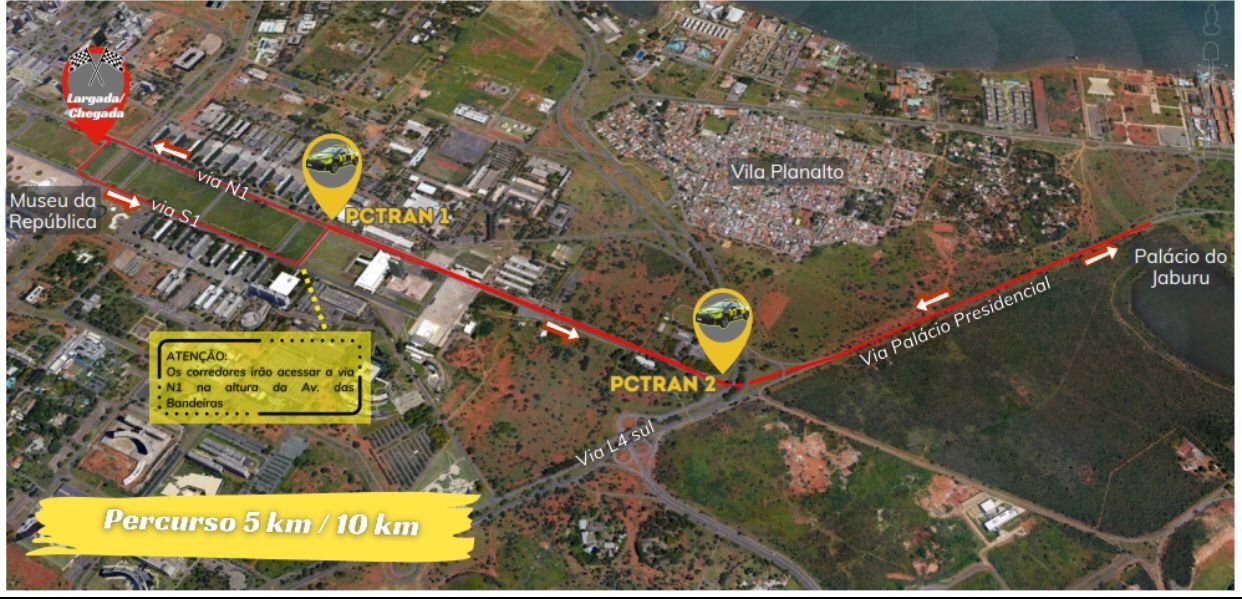 No domingo (15), das 6h30 às 11h, o trânsito na Esplanada dos Ministérios terá intervenção devido à Corrida do Cerrado, que tem largada prevista para as 7h, em frente ao Museu da República. Os atletas ocuparão três faixas da esquerda, próximas ao canteiro central na via S1, acessando a via N1 na altura da Avenida das Bandeiras. As demais faixas estarão liberadas para o tráfego de veículos. Na via N1, quatro faixas serão interditadas. O bloqueio ocorrerá da altura da L2 Norte até o quartel do Corpo de Bombeiros Militar (CBMDF). Apenas uma faixa será destinada aos veículos que estiverem saindo dos ministérios. O acesso à via N1, pela L4 Norte, ficará fechado durante todo o evento. Duas faixas na Via Palácio Presidencial até próximo ao Palácio do Jaburu também ficarão fechadas para o tráfego de veículos.